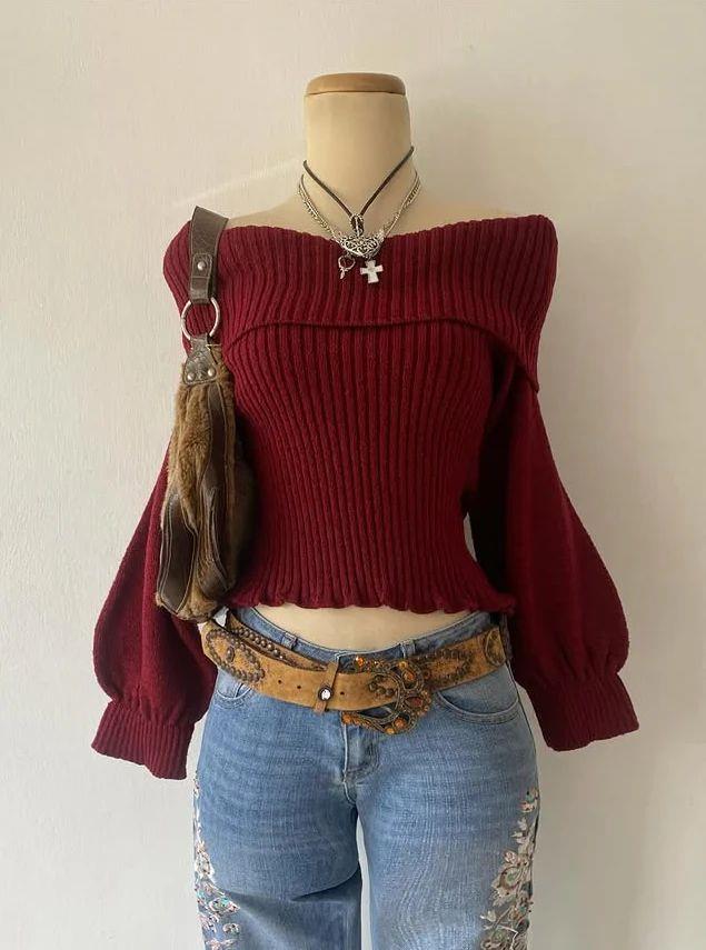 Bordo Madonna Yaka Büzgülü Kol Triko Kazak (BLN-KZKS-20)