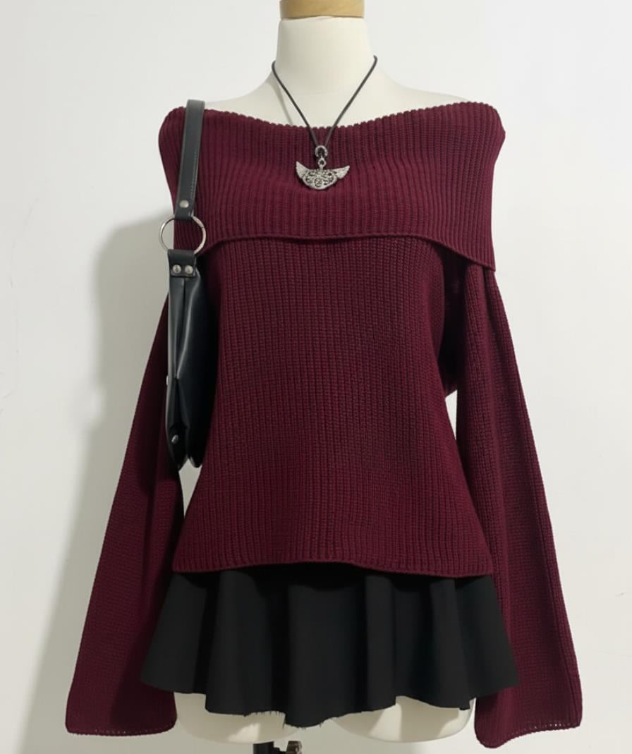 Bordo Madonna Yaka İspanyol Kol Triko Kazak (BLN-KZKS-10)