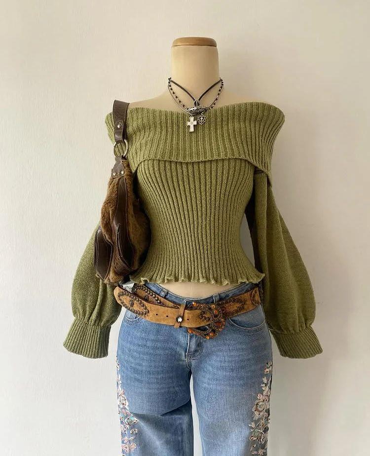 Haki Madonna Yaka Büzgülü Kol Triko Kazak (BLN-KZKS-24)