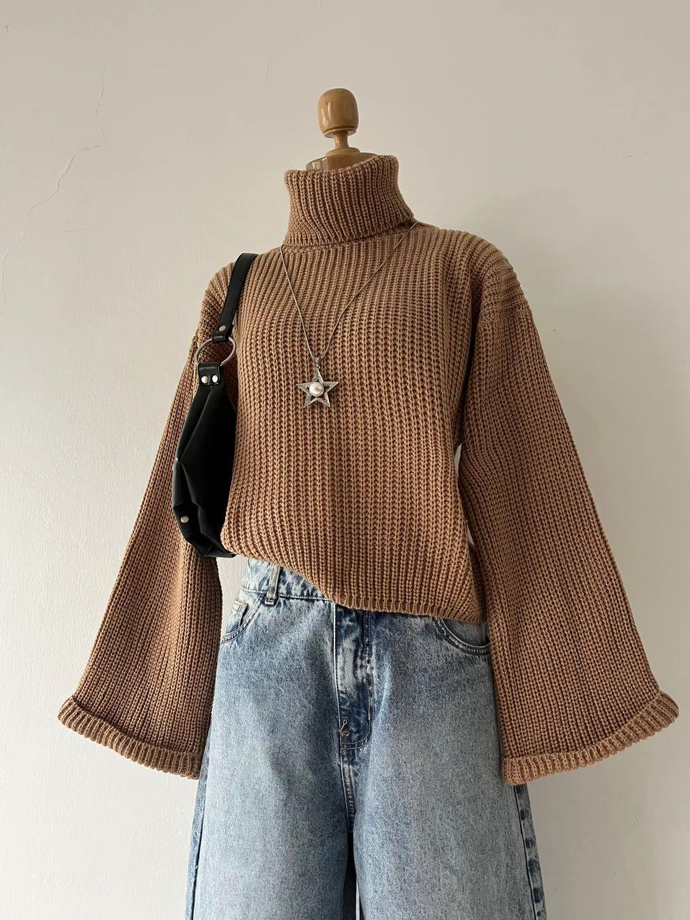 Kahverengi Boğazlı İspanyol Kol Triko Kazak