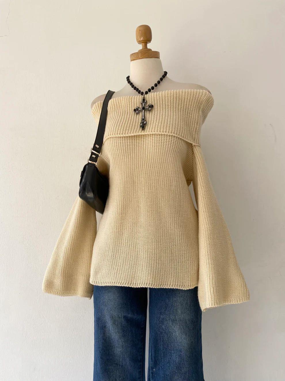 Krem Madonna Yaka İspanyol Kol Triko Kazak
