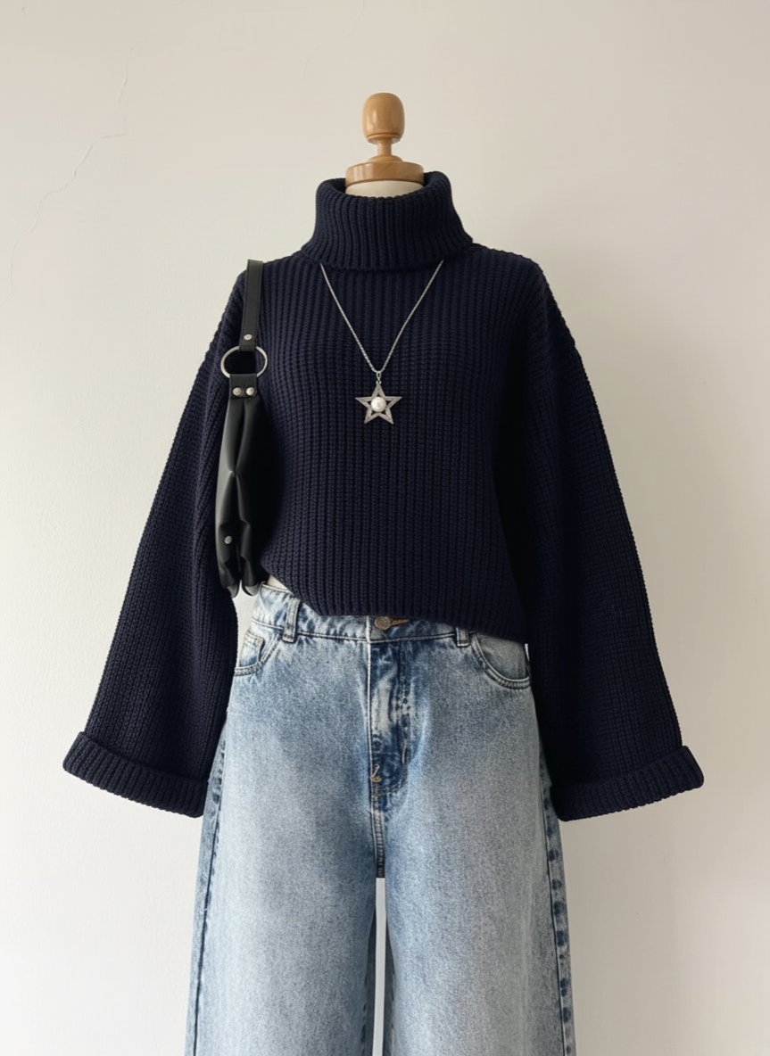 Lacivert Boğazlı İspanyol Kol Triko Kazak
