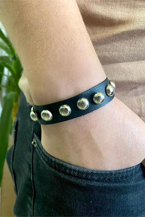 Siyah Yuvarlak Metal Detaylı Deri Bileklik
